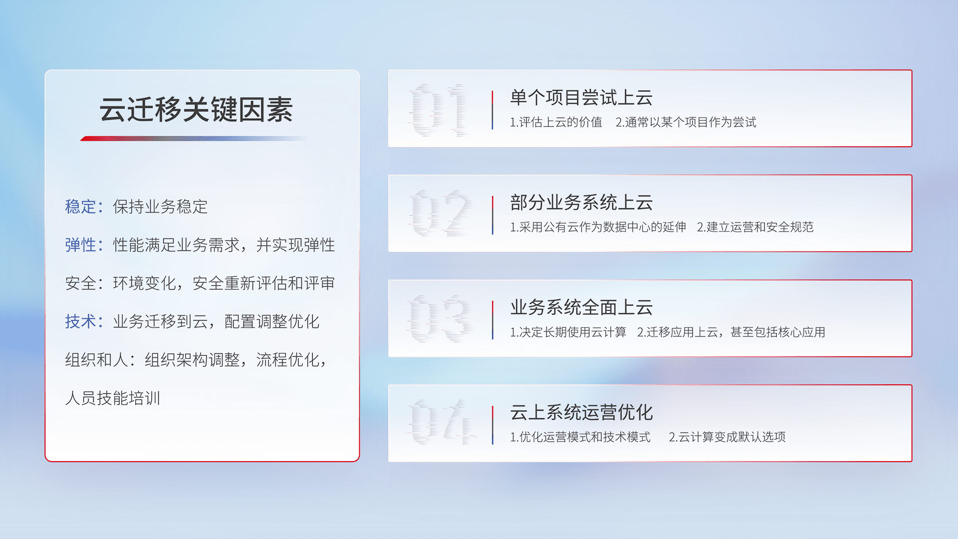 结合实际业务,,从规划设计、、云平台选型、、云原生改造、、、、数据迁移、、、、集成交付,,迁移全过程为客户识别最佳上云路径,,,做好风险识别管理,,设计网络架构、、、、身份权限、、、安全审计合规、、、、操作审计、、、、日志审计、、、、监控告警策略、、、、多站点容灾设计等,,对云上基础设施进行整体规划,,提升IT治理水平,,以满足弹性、、高可用、、、高性能的需求。。