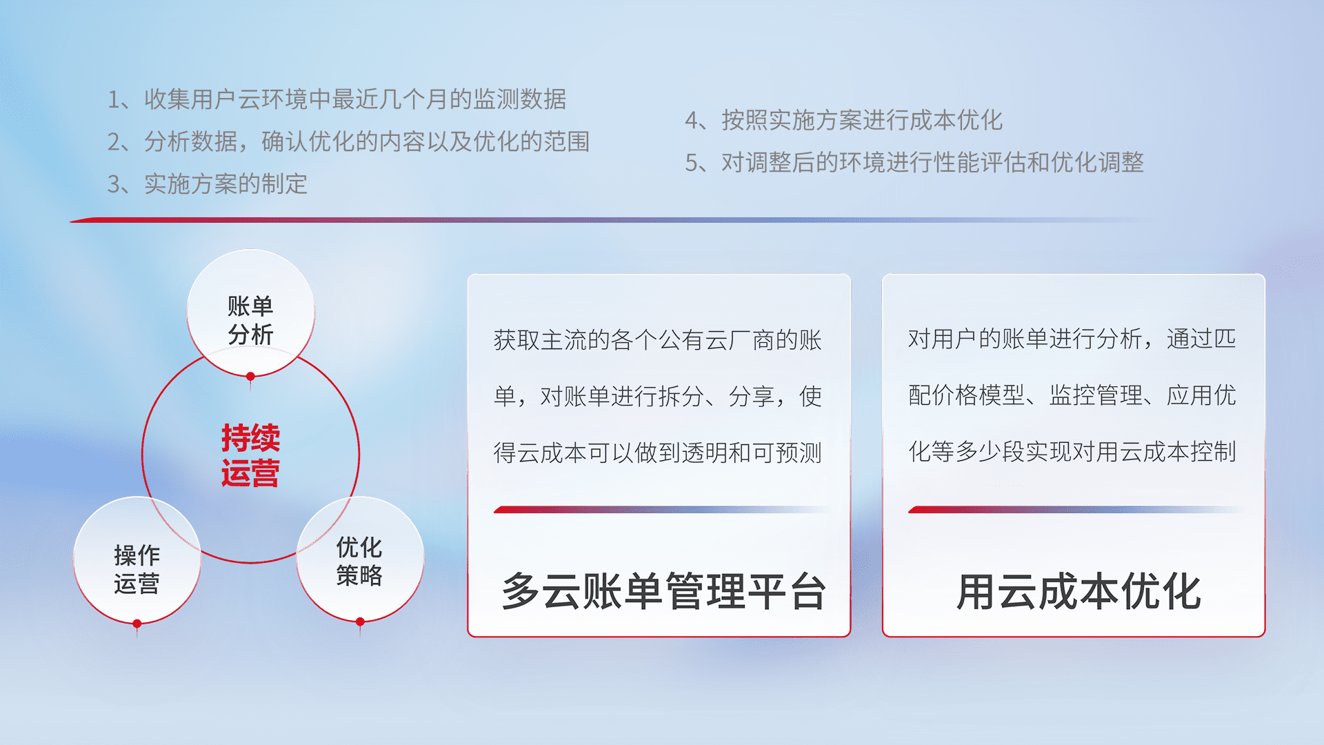 通过多云纳管,,,,以统一的资源数据模型把客户的云资源进行抽象和封装,,,,进而实现对多云资源的统一操作,,,保障云资源管理的可靠性、、、、稳定性与可用性。。。。量身定制化运维内容,,,,配置、、、、开发运维、、、、补丁管理、、、、备份、、监控、、、、认证和访问管理、、、审计和日常巡检等,,,保障在用云过程中的可靠度,,,稳定度以及高可用率。。。